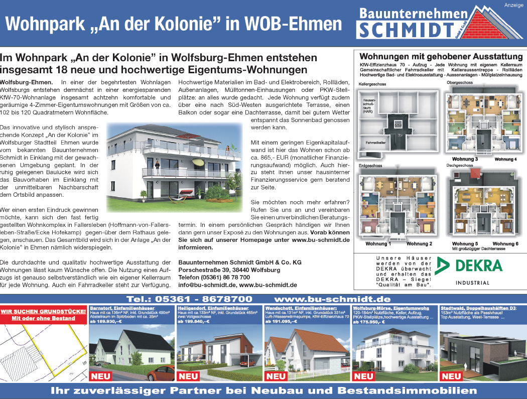 In einer der begehrtesten Wohnlagen Wolfburgs entstehen demnächst in einer energiesparenden KfW-70-Wohnanlage insgesammt achtzehn komfortable und hellräumige 4-Zimmer-Eigentumswohnungen mit Größen von ca. 102 bis 120 Quadratmetern Wohnfläche.