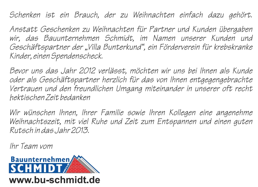 Wir wünschen Ihnen, Ihrer Familie sowie Kollegen eine angenehme Weihnachtszeit, mit viel Ruhe und Zeit zum Entspannen und einen guten Rutsch in das Jahr 2013. Ihr Team von BU-Schmidt