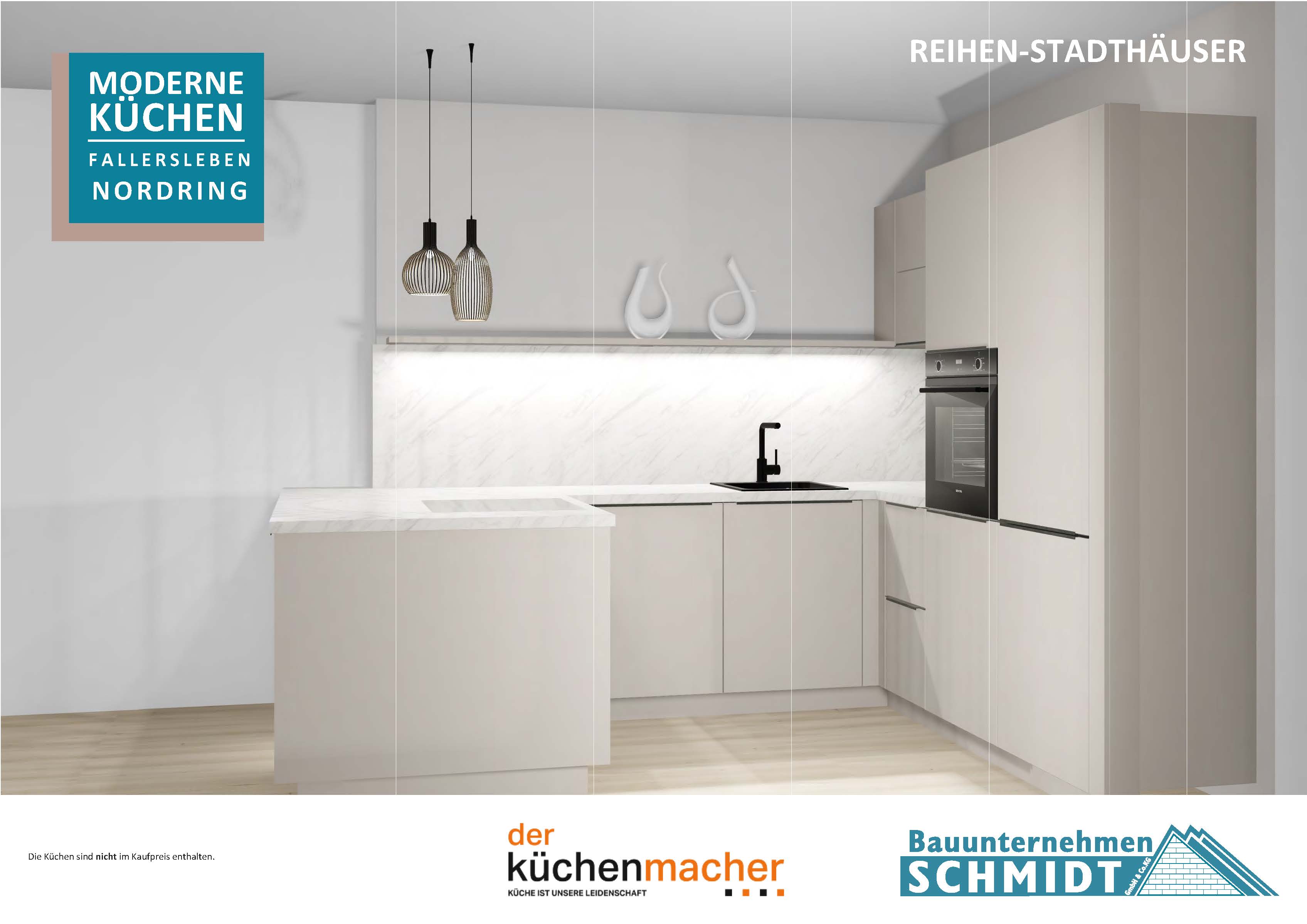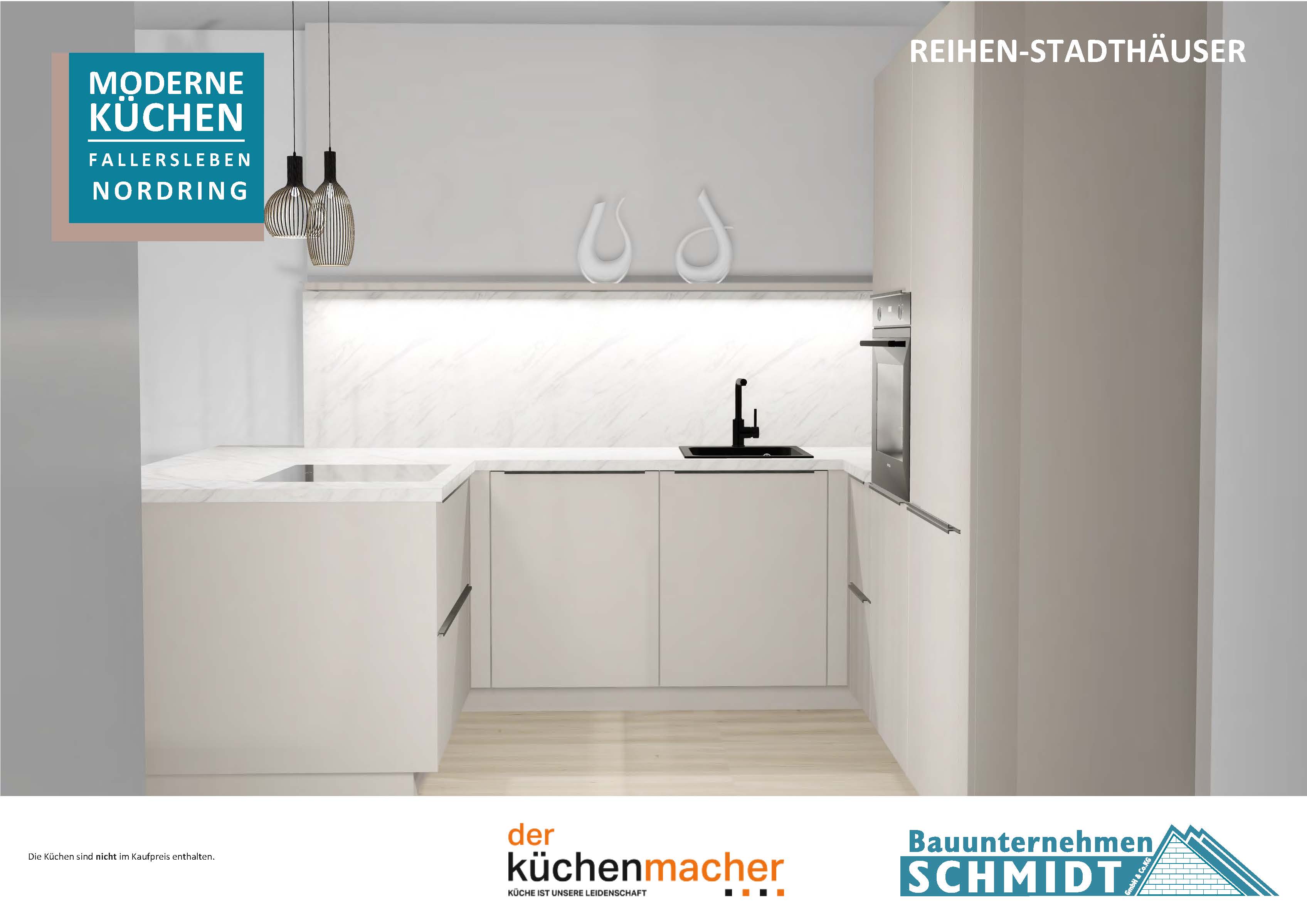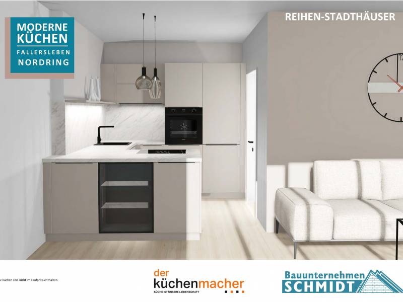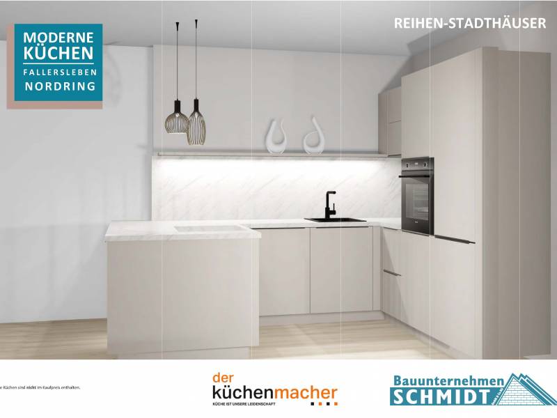 RH3 (Nordring 16c) ist als Musterhaus bereits mit einer Musterküche von "Der Küchenmacher" und mit Bodenbelag "ExponaLiving" ausgestattet (siehe PDF-Dateien), diese Mehrausstattung ist nicht im Kaufpreis enthalten und wird beim Kauf separat abgerechnet! Somit wäre RH03 aber sofort bezugsfertig! Das RH02 (Nordring 16b) und RH04 (Nordring 16e) sind bezüglich der Bodenbelags- und Küchenwahl frei, in Eigenleistung ausführbar oder auf Wunsch über uns gegen Mehrpreis dazu buchbar - sprechen Sie uns gern an!