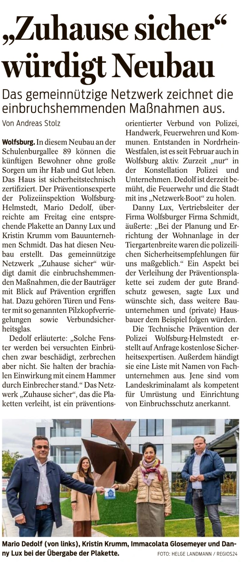 Das gemeinnütziges Netzwerk zeichnet die einbruchshemmenden Maßnahmnen aus. Quelle: Wolfsburger Nachrichten 26.09.2020