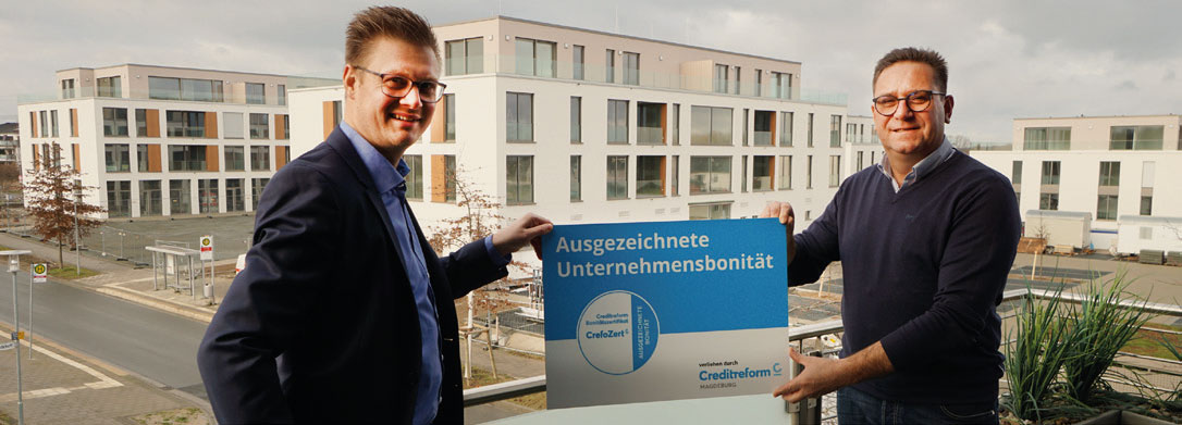 Das Zertifikat wurde von Björn Adlung an den Geschäftsführenden Gesellschafter Thorsten Schmidt überreicht. Im Rahmen der Zertifizierung wurde der Jahresabschluss auf „Herz und Nieren“ geprüft und das Unternehmen auf ihre Zukunftsperspektive untersucht. Das Ergebnis ist das CrefoZert-Siegel, welches nur wenige Prozent aller Unternehmen in Deutschland erhalten. In diesem Zusammenhang bedankt sich das Bauunternehmen Schmidt für die vertrauensvolle Zusammenarbeit mit der Volksbank BraWo und allen Projektpartnern.