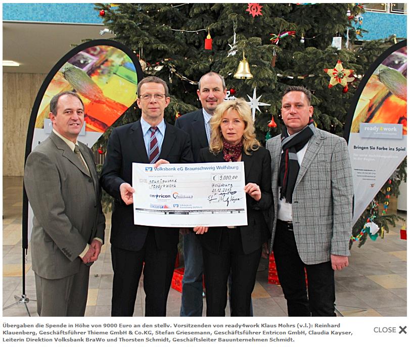 Für ein ganz besonderes Geschenk entschieden sich vier Wolfsburger Unternehmen auf Vorschlag der Volksbank BraWo: Sie spendeten insgesamt 9.000 Euro an den Förderverein ready4work e.V., der gemeinsam mit dem RegionalVerbund für Ausbildung e.V. (RVA) Ausbildungsplätze in Wolfsburg, Gifhorn und Helmstedt mitfinanziert. Beteiligt waren neben der Volksbank BraWo das Bauunternehmen Schmidt, die Thieme GmbH & Co. KG und die Entricon GmbH.