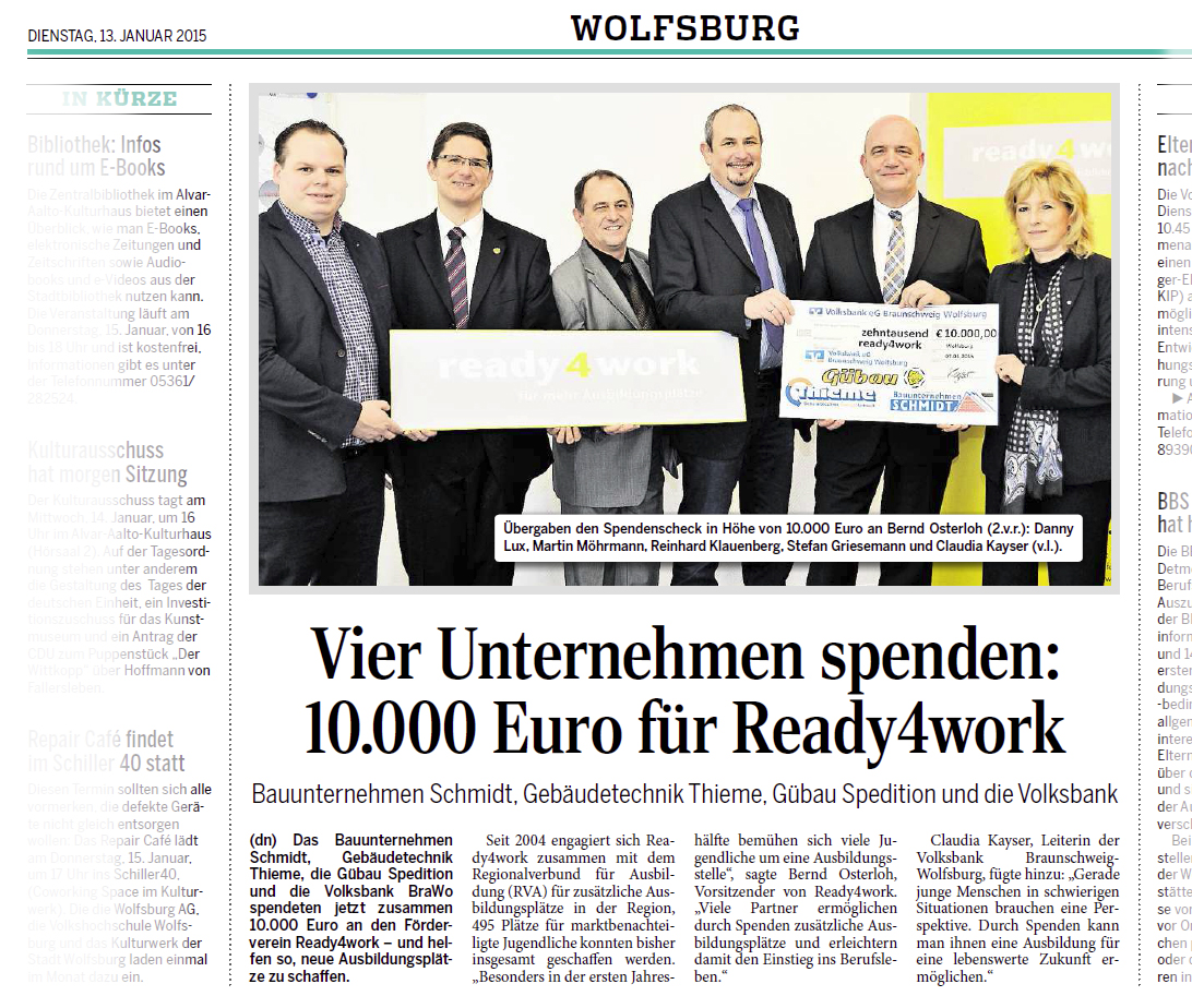 Das Bauunternehmen Schmidt, Gebäudetechnik Thieme, die Gübau Spedition und die Volksbank BraWo spendeten jetzt zusammen 10.000 Euro an den Förderverein Ready4work - und helfen so, neue Ausbildungsplätze zu schaffen.