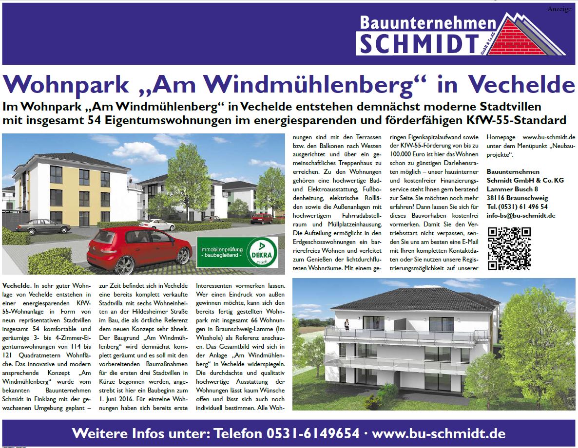Im Wohnpark „Am Windmühlenberg“ in Vechelde entstehen demnächst moderne Stadtvillen mit insgesamt 54 Eigentumswohnungen im energiesparenden und förderfähigen KfW-55-Standard. Hier Vormerken
