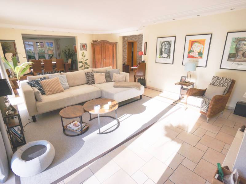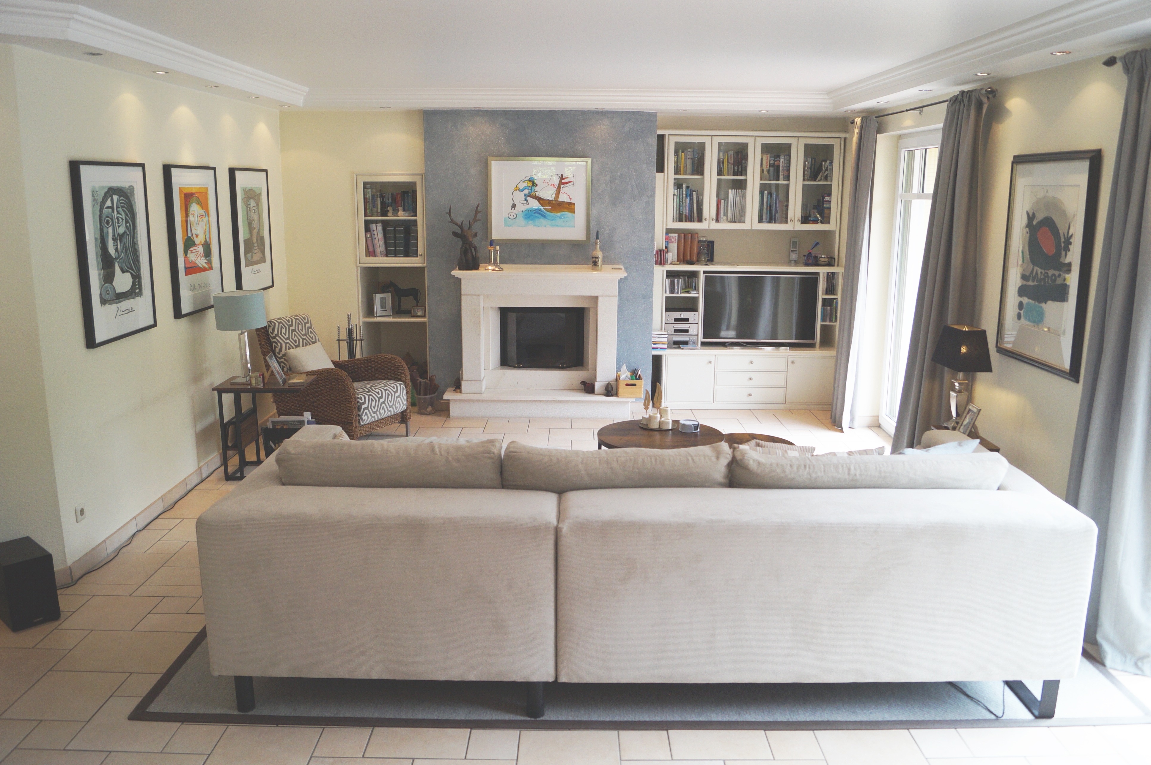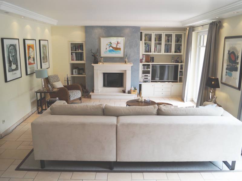 Dank zahlreicher Fenster wird das Haus den ganzen Tag über von natürlichem Licht durchflutet. Der großzügige Wohn- und Essbereich ist mit hochwertigen Natursteinfliesen und einer wohligen Fußbodenheizung ausgestattet. Sein Herzstück ist ein eleganter Kamin, dessen Glasscheibe sich hochfahren lässt - so genießen Sie die sichere Wärme eines geschlossenen Kamins mit dem Knistern eines offenen Feuers.