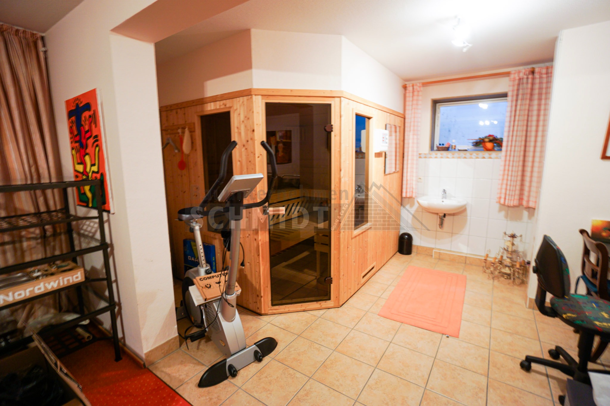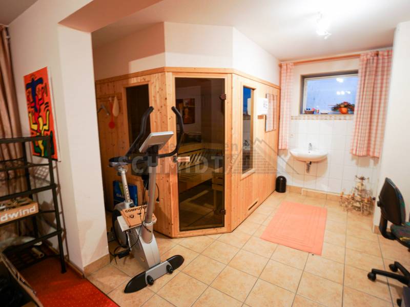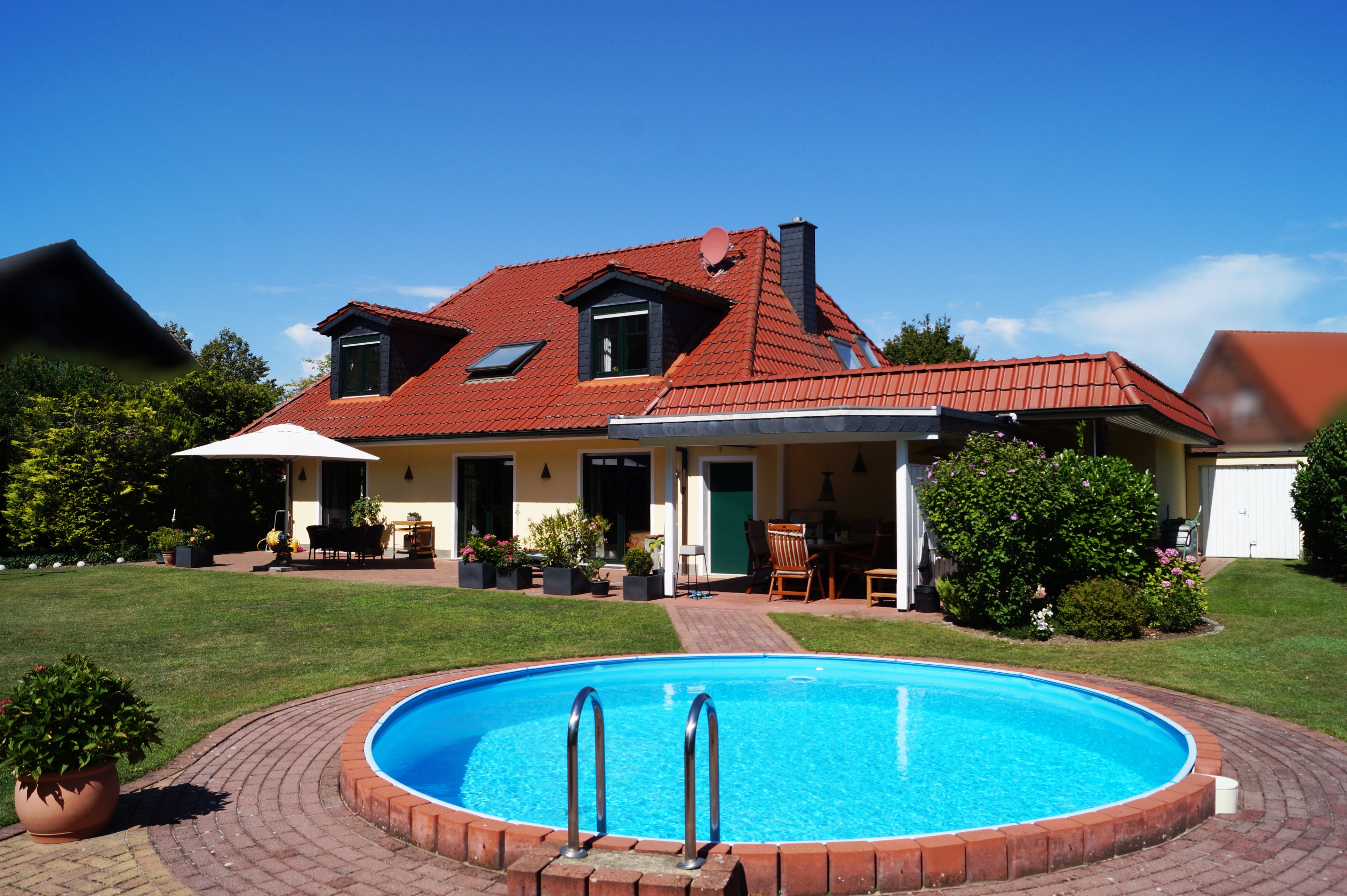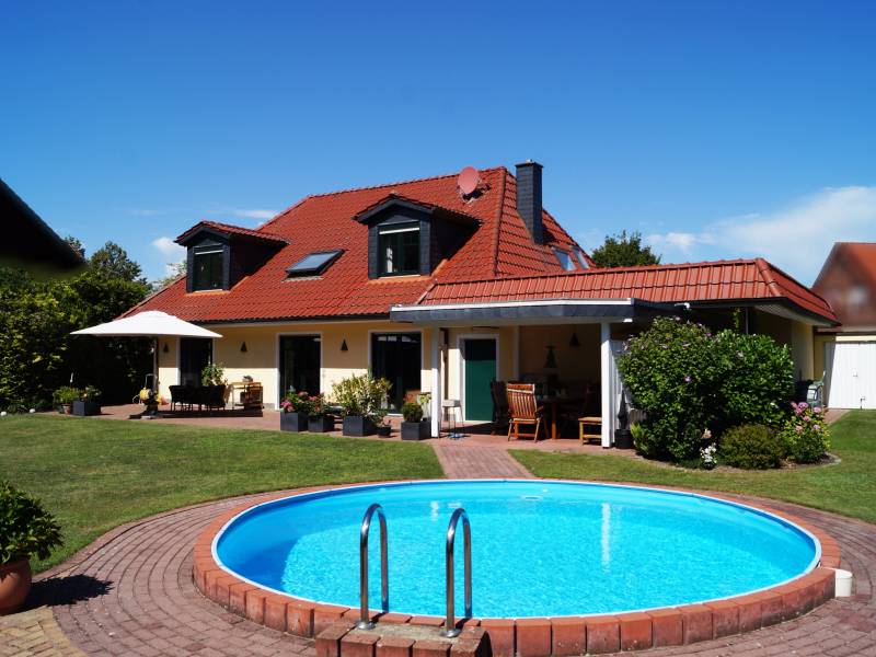 Im Keller befindet sich eine großzügige Sauna, die Platz für mehrere Personen bietet. Runder Außenpool, der nachhaltig und kostensparend durch Solarplatten auf dem Dach beheizt wird. Die geflieste Terrasse erstreckt sich über die gesamte Hausbreite und