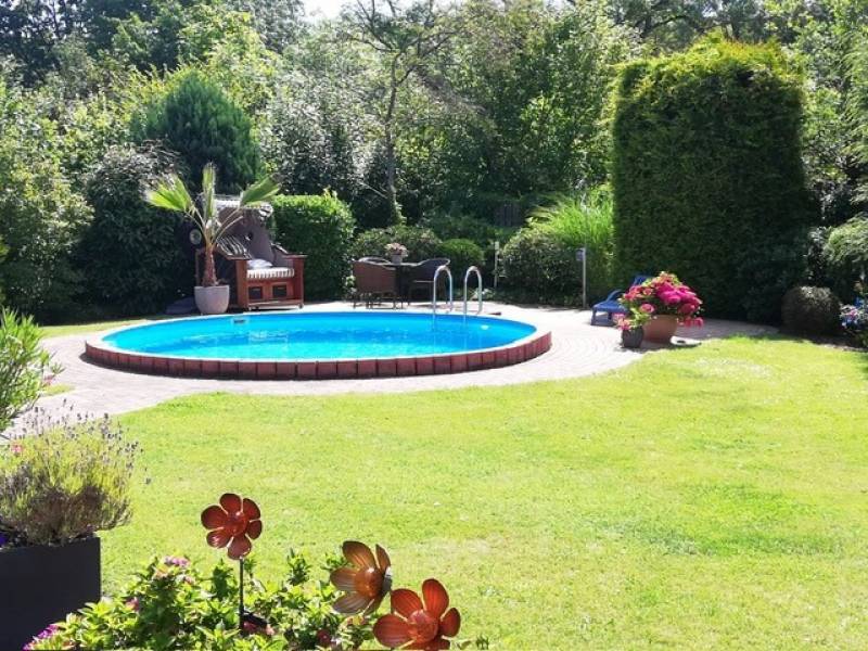 Bepflanzung: Der Garten ist von Grünpflanzen umgeben, die zu verschiedenen Jahreszeiten