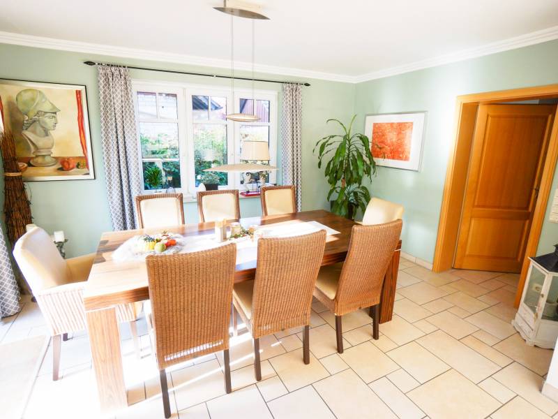 Von hier aus treten Sie direkt auf die weitläufige Terrasse, die sich über die gesamte Hausbreite erstreckt und einen wunderbaren Blick in den Garten freigibt.