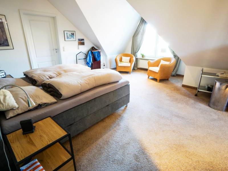 Eine breite Steintreppe führt in den oberen Bereich. Hier befinden sich neben zwei Kinderzimmern mit eigenem Kinderbad, einem Büro und der geräumige Schlafbereich mit einem Giebelfenster für die Eltern. Für den besonderen Komfort gibt es ein offenen, vom Tischler angefertigten Schrankbereich und ein großes Bad en Suite.